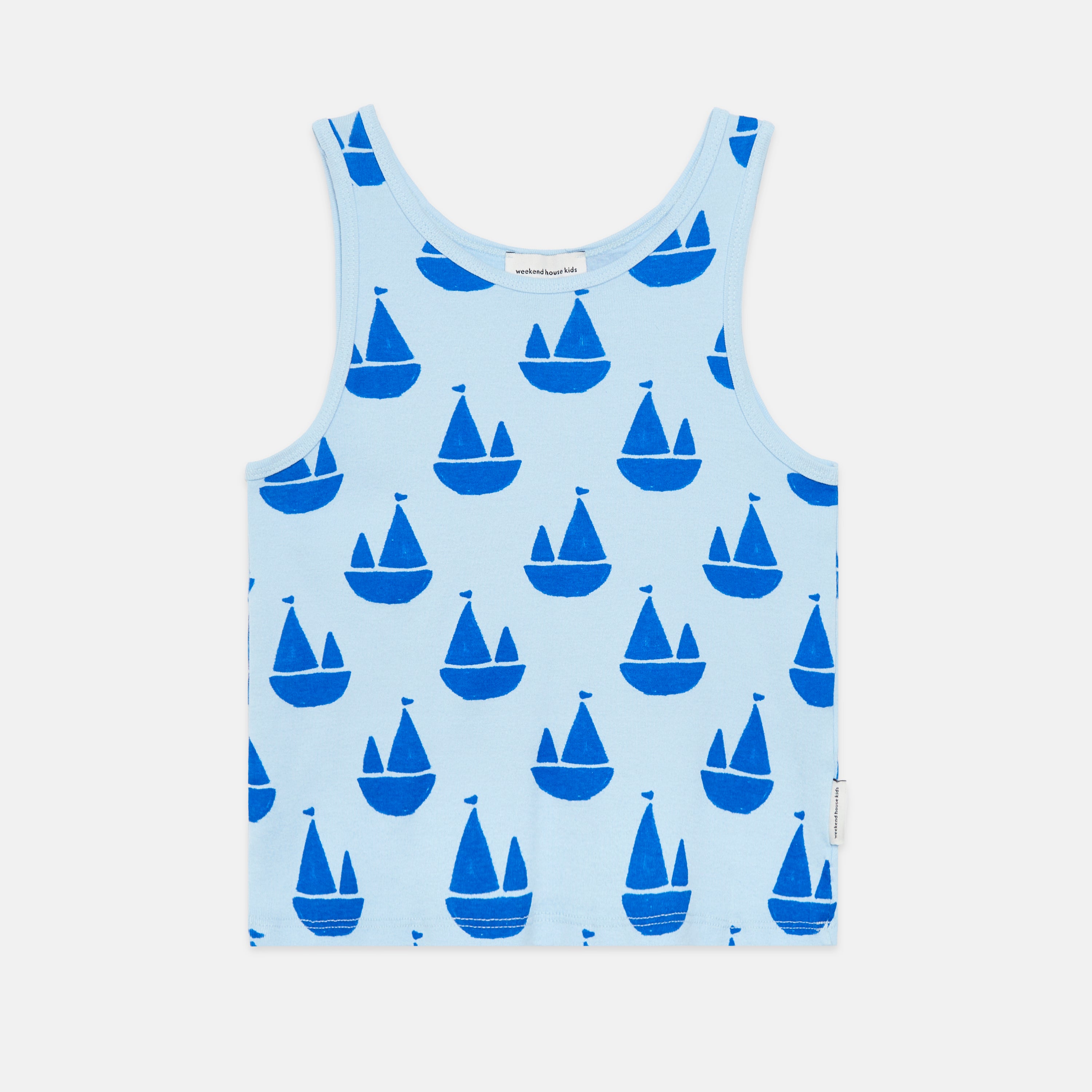 Set sail in style with this vibrant all-over boat print top. Featuring a bold red and blue pattern, this breezy sleeveless top is perfect for sunny days, beach trips, and warm-weather play. Lightweight and easy to move in — because little ones never stop exploring.
