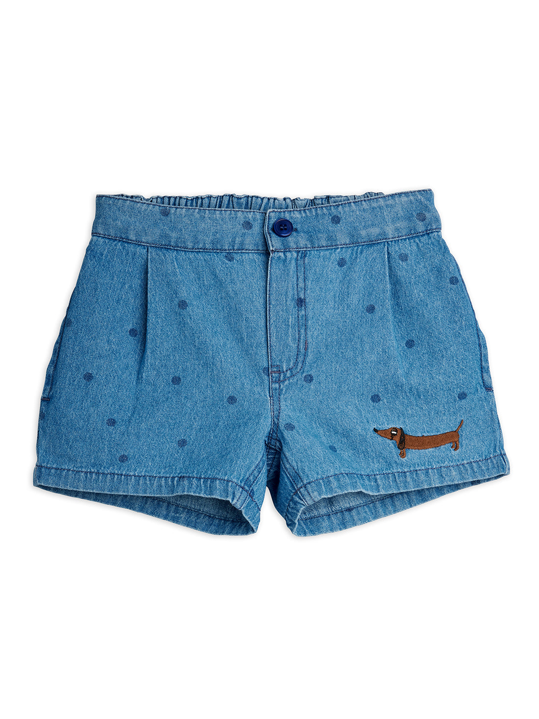 Denim shorts made from 100% organic cotton. Features a dots print, front pleats, side pockets and an embroidered dog motif. Elasticated waist with front button for comfort.