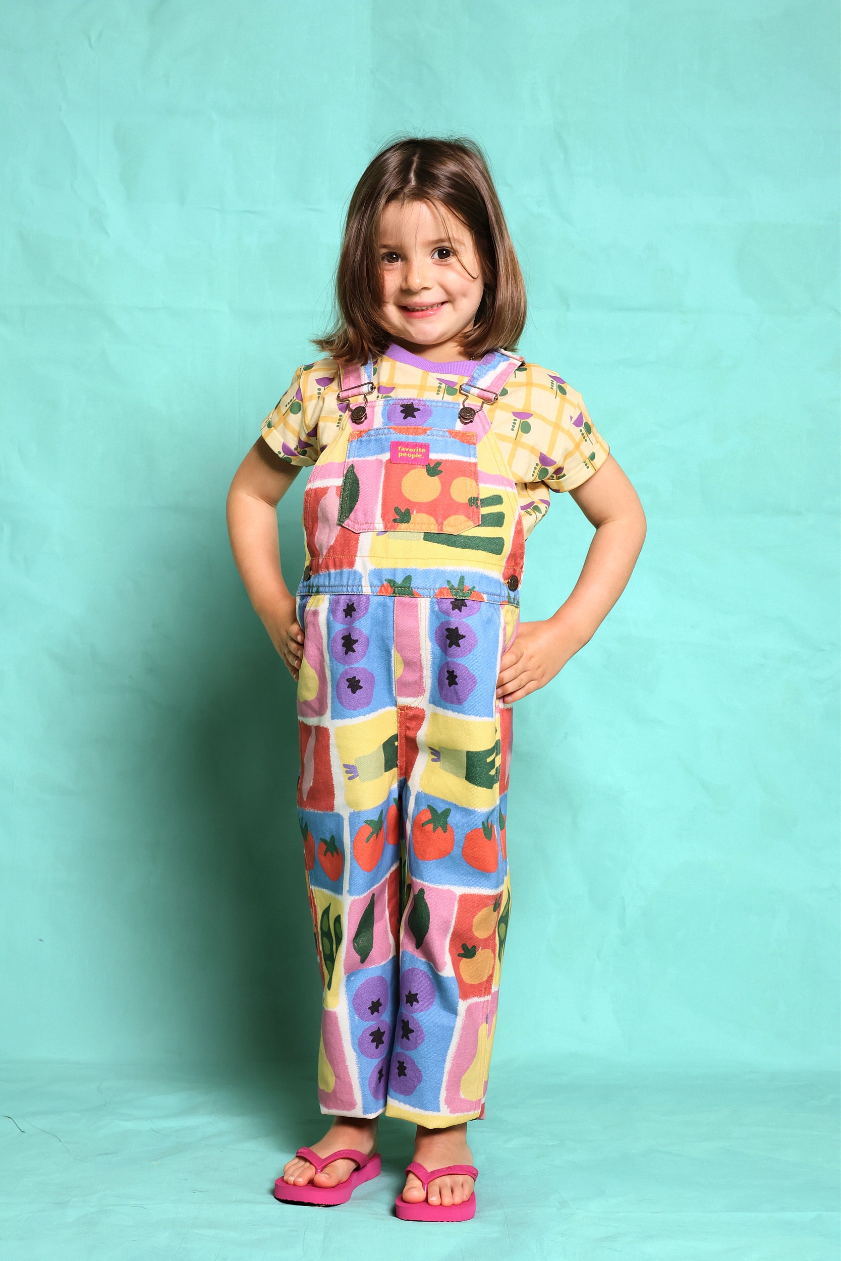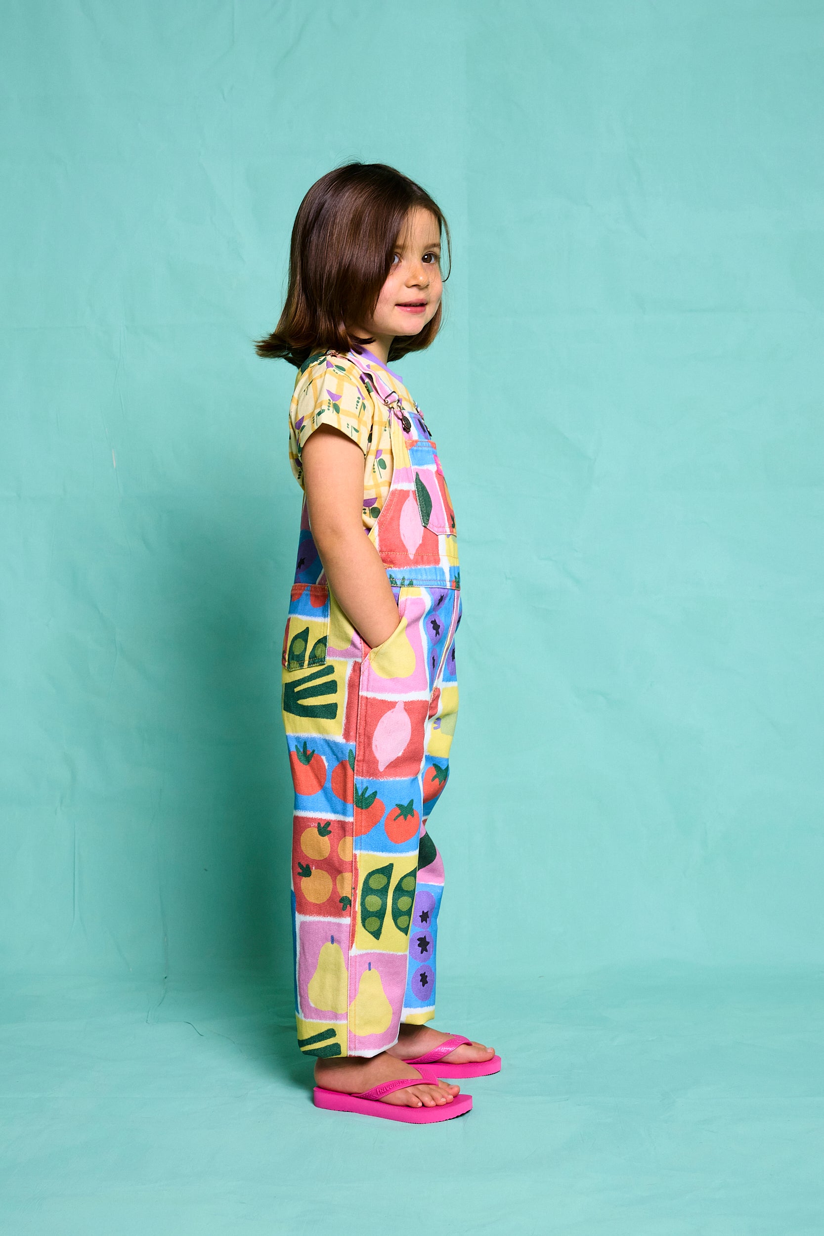 These timeless long overalls in a vibrant multicolour design, featuring an assortment of fruits and vegetables, are built for comfort, play, and endless fun. Featuring a straight neckline, adjustable straps with button closures, and front and back pockets for all the little treasures.