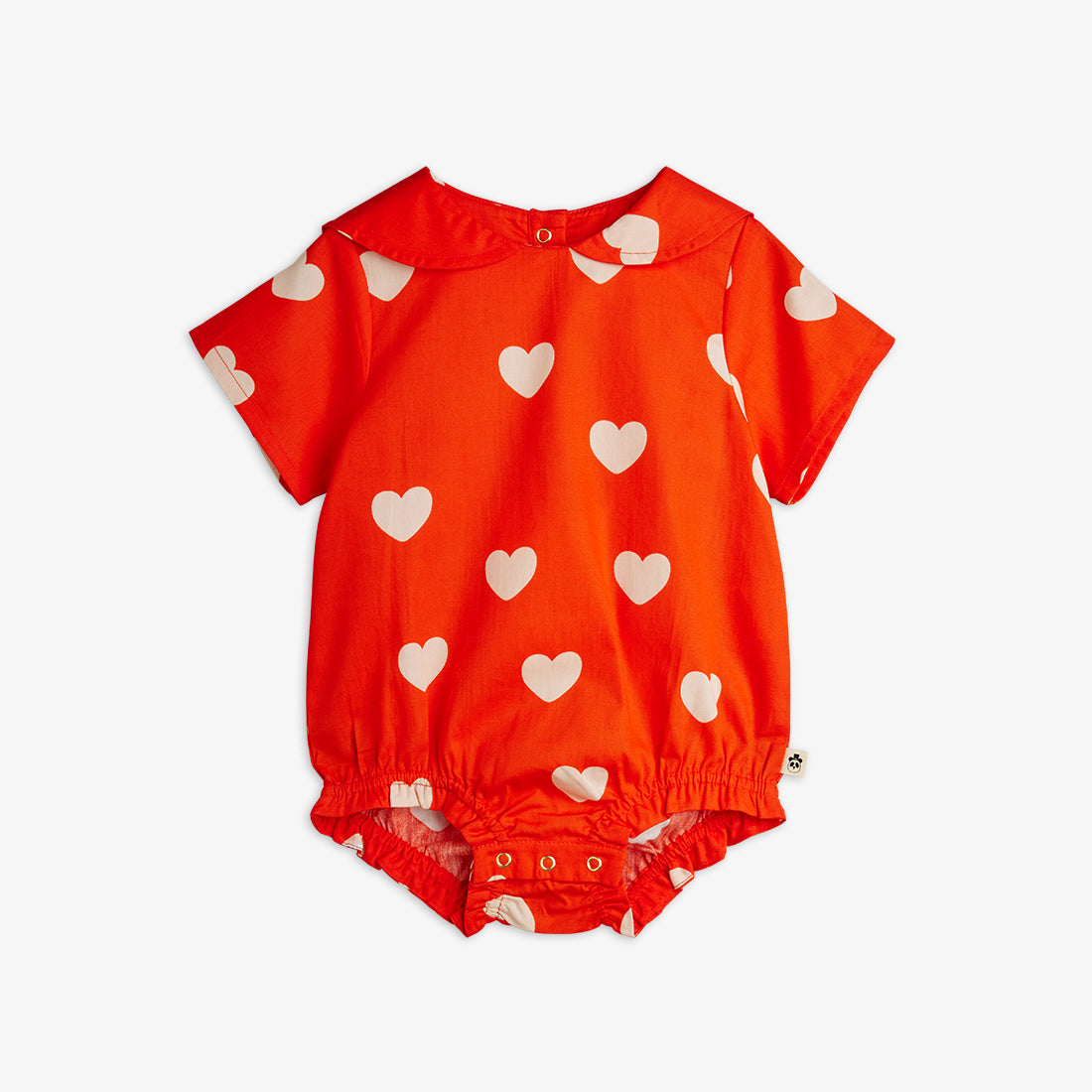 Short-sleeve body made from 100% GOTS-certified organic cotton. Designed with a sailor collar, snap buttons at the back and crotch, and an all-over heart print.Features