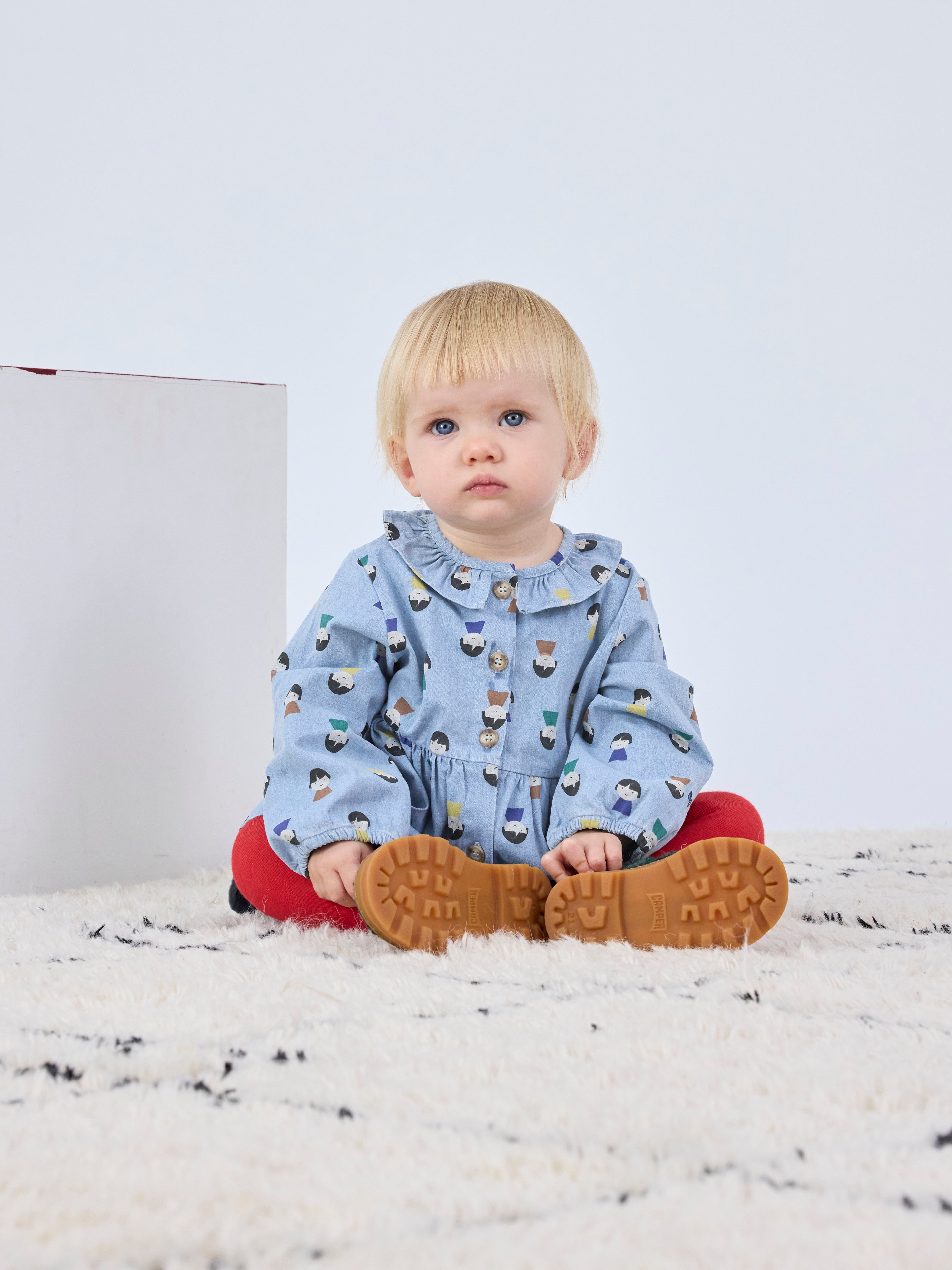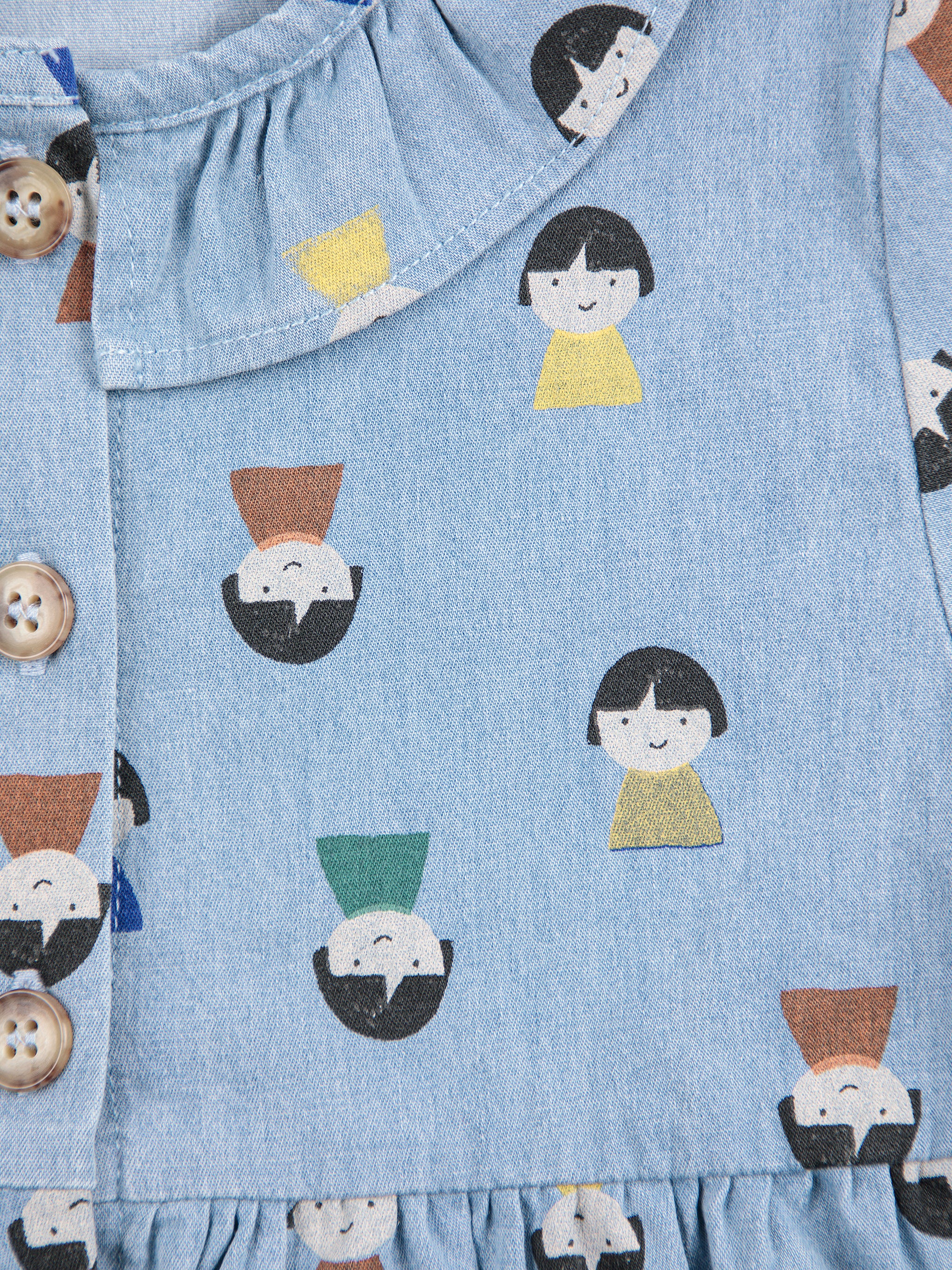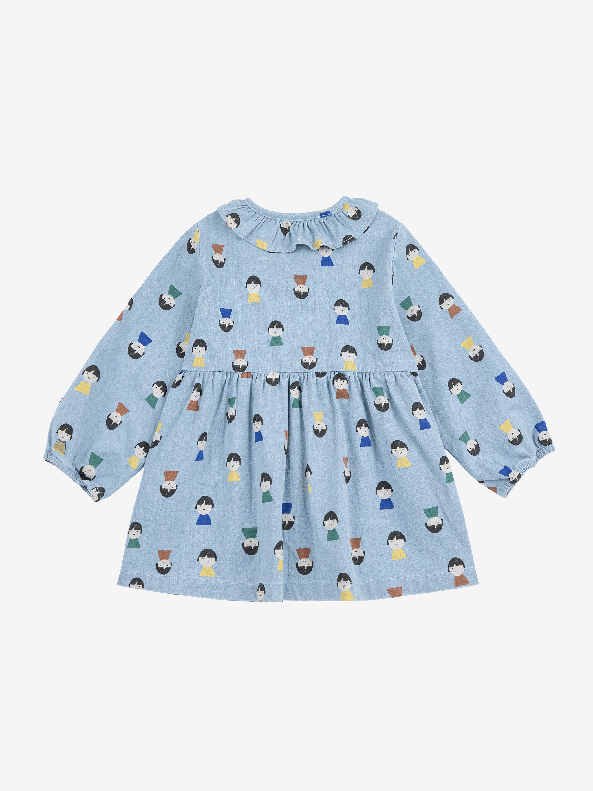 The dress offers long sleeves with dropped shoulders and elasticated cuffs for a relaxed fit. It includes front button fastening, a round neck, over-knee length, and an evasé silhouette with ruffled detailing. The all-over game pawns print adds a touch of imagination, inspired by board games and childhood adventures.