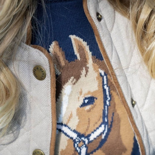 Saddle up her style sustainably. This Hope & Henry Horse Intarsia Sweater is knit from 100 % GOTS-certified organic cotton. The navy base highlights a charming horse motif and faux-suede elbow patches. Shoulder buttons make dressing wriggly babies fast and fuss-free.