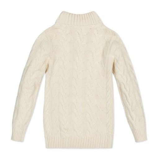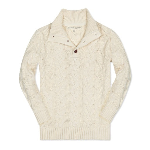 Luxuriously plush cables in Hope & Henry's signature organic cotton yarns make this sweater a must have for cooler months. Features a rib knit mock neck with faux leather button closures at the center front placket. Fully adorned with a classic cable knit.