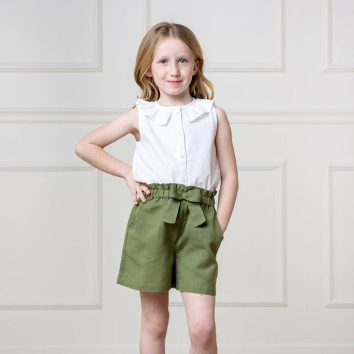 Hope & Henry's Linen Paper Bag shorts are an easy breezy cinched waist short in a soft organic cotton linen blend will keep your girl comfortable all spring and summer long. Features paper bag styling, side pockets, a waist tie with bow, and elastic at the back waist for easy on and off.