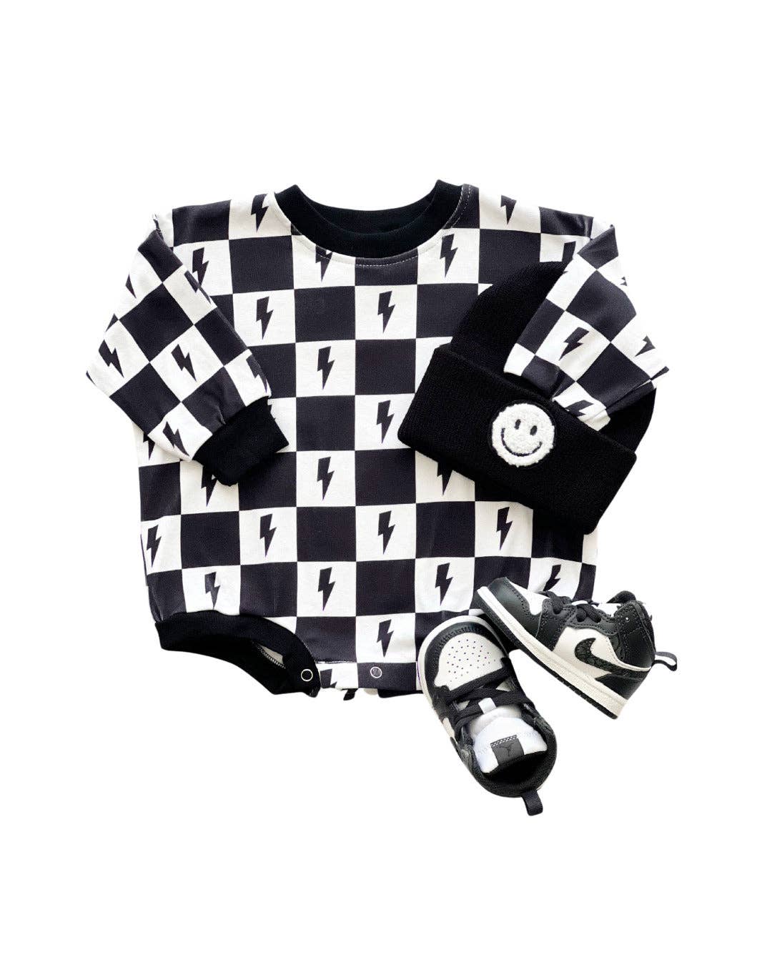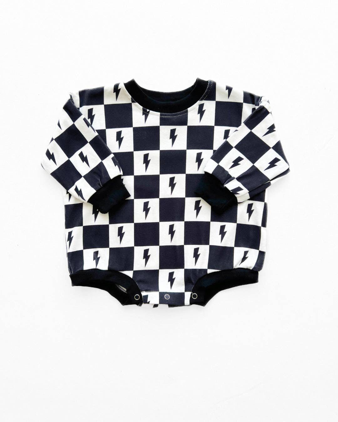 Introducing the Charcoal Bolts bubble romper—a perfect blend of vintage charm and modern style. The dusty black printed lightning bolts add a cool, edgy touch to this long sleeve romper. Crafted from a soft, stretchy fabric of 95% cotton and 5% spandex, it ensures all-day comfort for your little trendsetter.