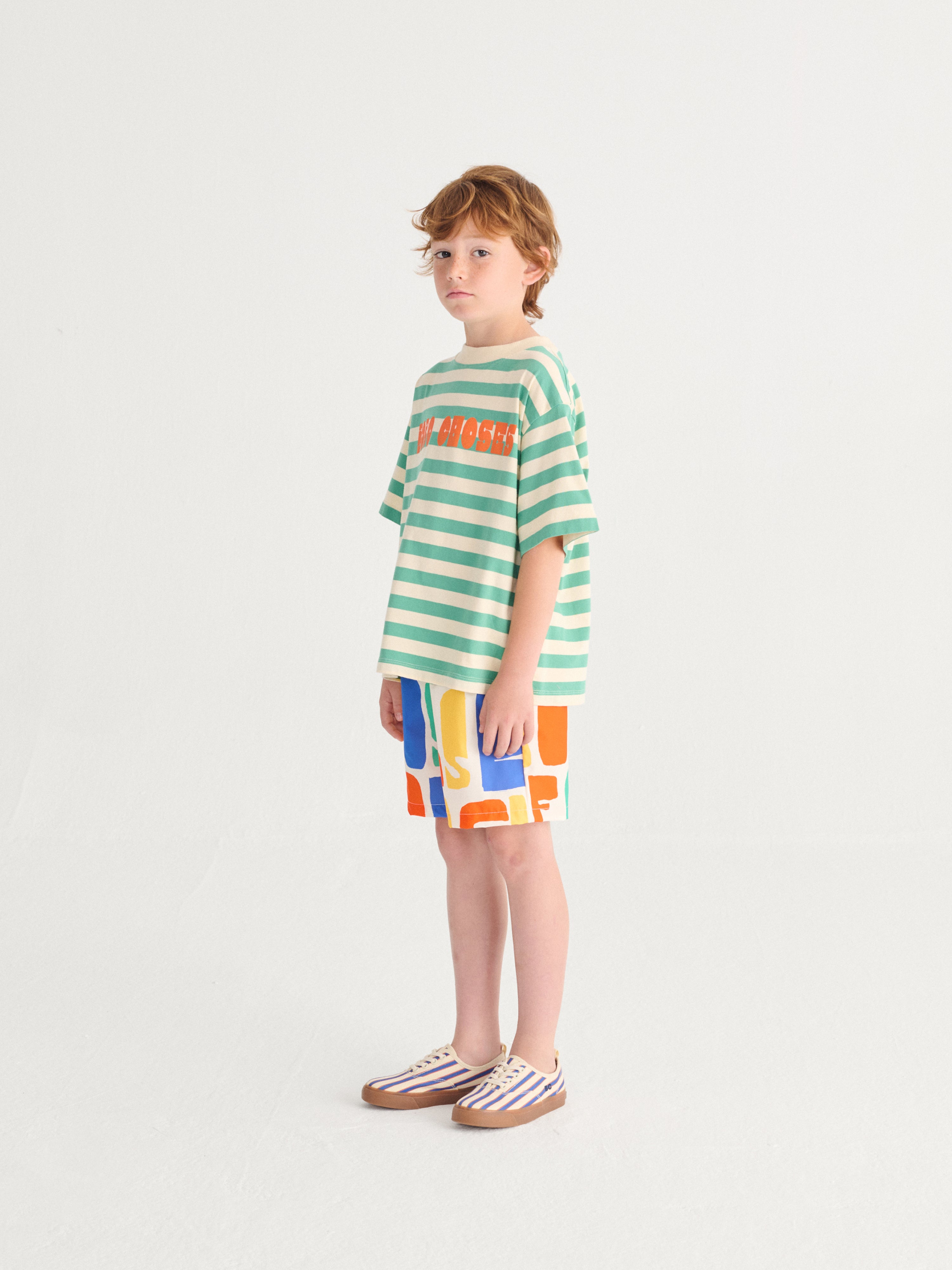 Stripes just got a whole lot cooler. The Modern Stripped TShirt brings bold green and white stripes with a pop of color detail for a look that's effortlessly fun. The relaxed, boxy fit and soft fabric keep kids comfortable whether they're running around outside or chilling at home. Pair it with their favorite pants or shorts — it goes with everything. A warm-weather staple they'll want to wear on repeat.