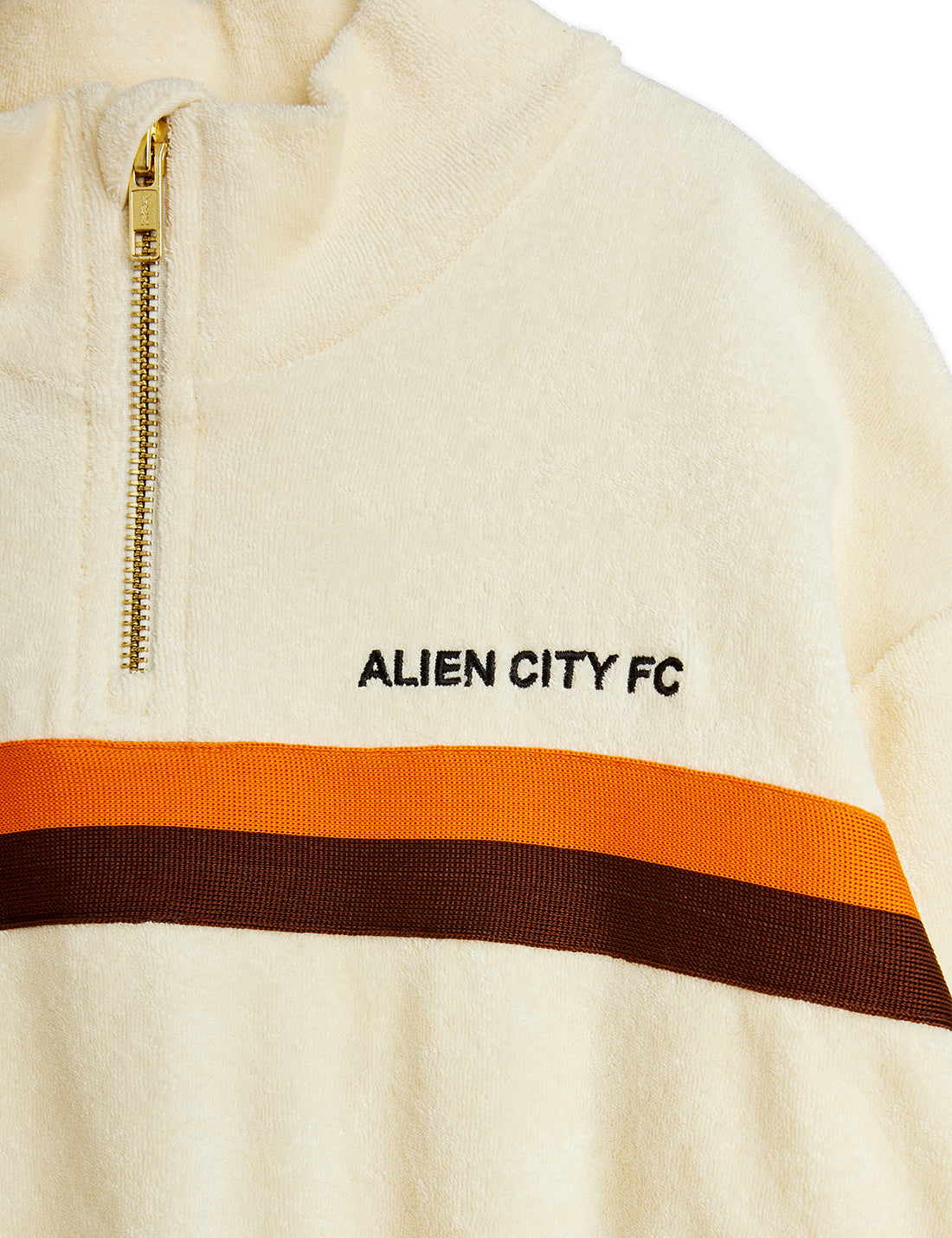Sport-inspired cool with a playful twist. This terry half-zip sweatshirt features an embroidered Alien City FC crest on a clean offwhite base — equal parts cozy and effortlessly stylish. The half-zip adds easy on-and-off for little ones and a touch of athletic edge for bigger kids. Made from organic cotton terry, grown without pesticides.