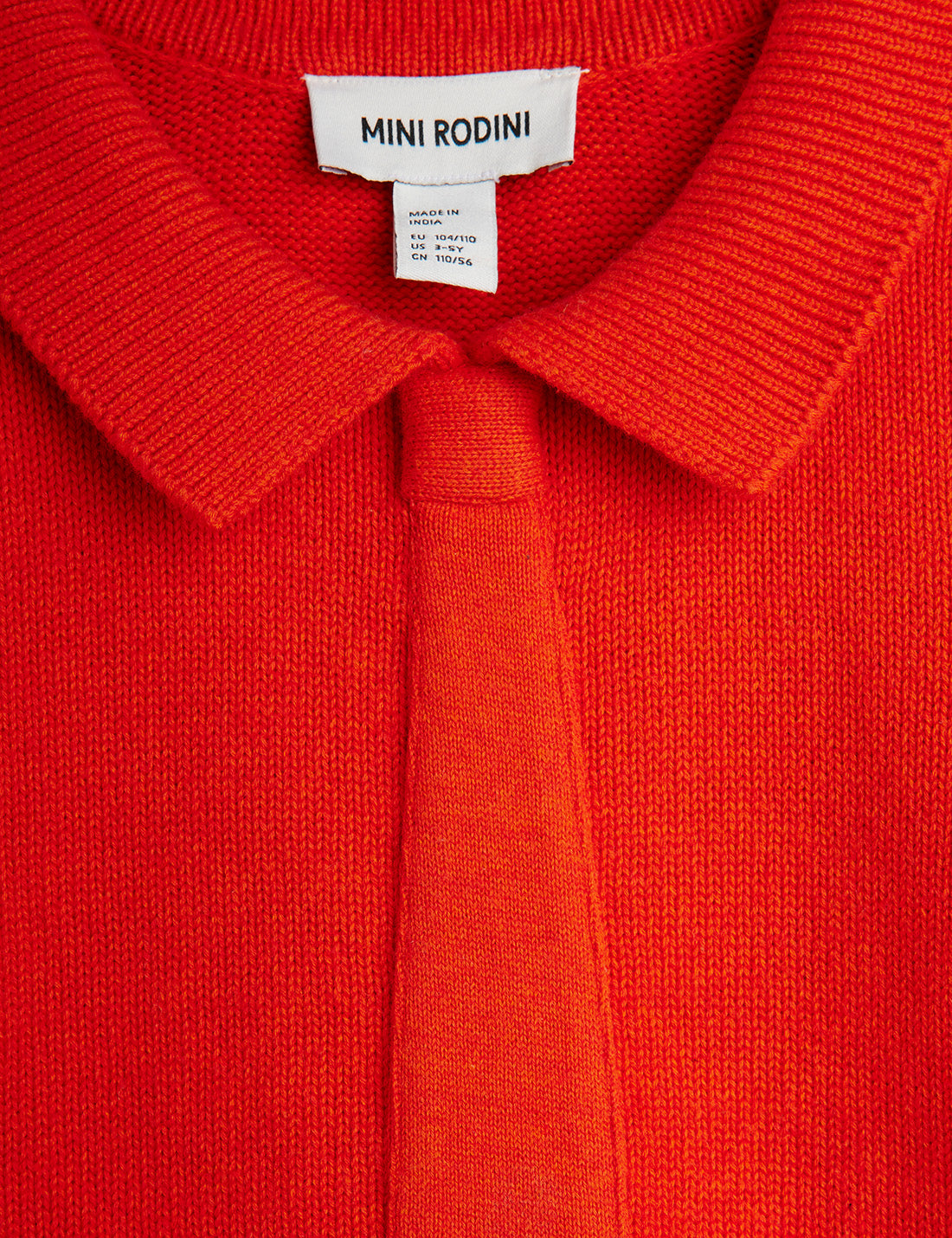 Knitted sweater made from GOTS-certified organic cotton and RWS-certified wool with a ribbed collar, cuffs, and hem. Designed with a fun faux tie detail at the front.