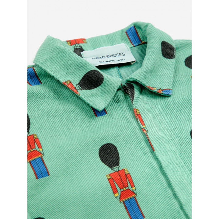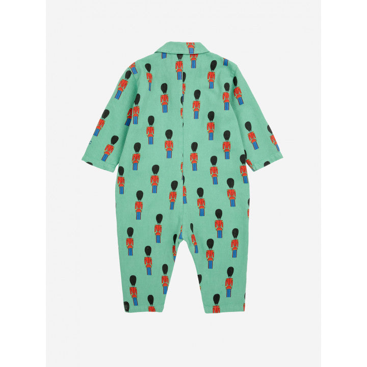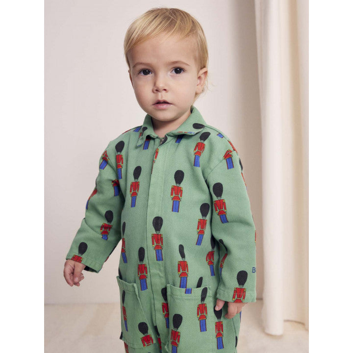 This enchanting green overall showcases Bobo Choses' playful tin soldiers print scattered across the fabric—a delightful nod to childhood imagination and vintage toy collections. Crafted from a sustainable blend of 50% cotton and 50% Lyocell, it offers the perfect combination of softness and durability.