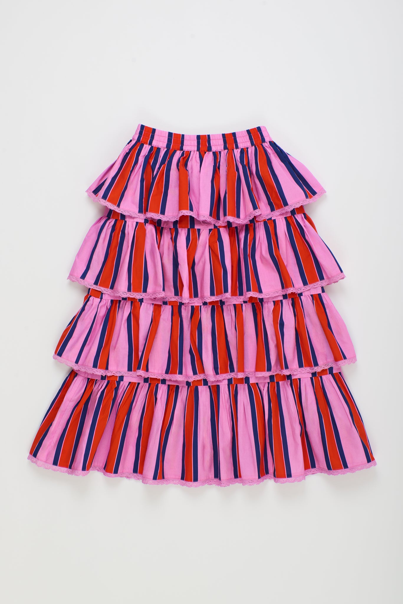 Sweet Ruffles Stripes Skirt in Pink with tiered ruffles and classic stripe pattern. Crafted from 100% cotton with a comfortable elastic waist. Perfect for twirling and playing.