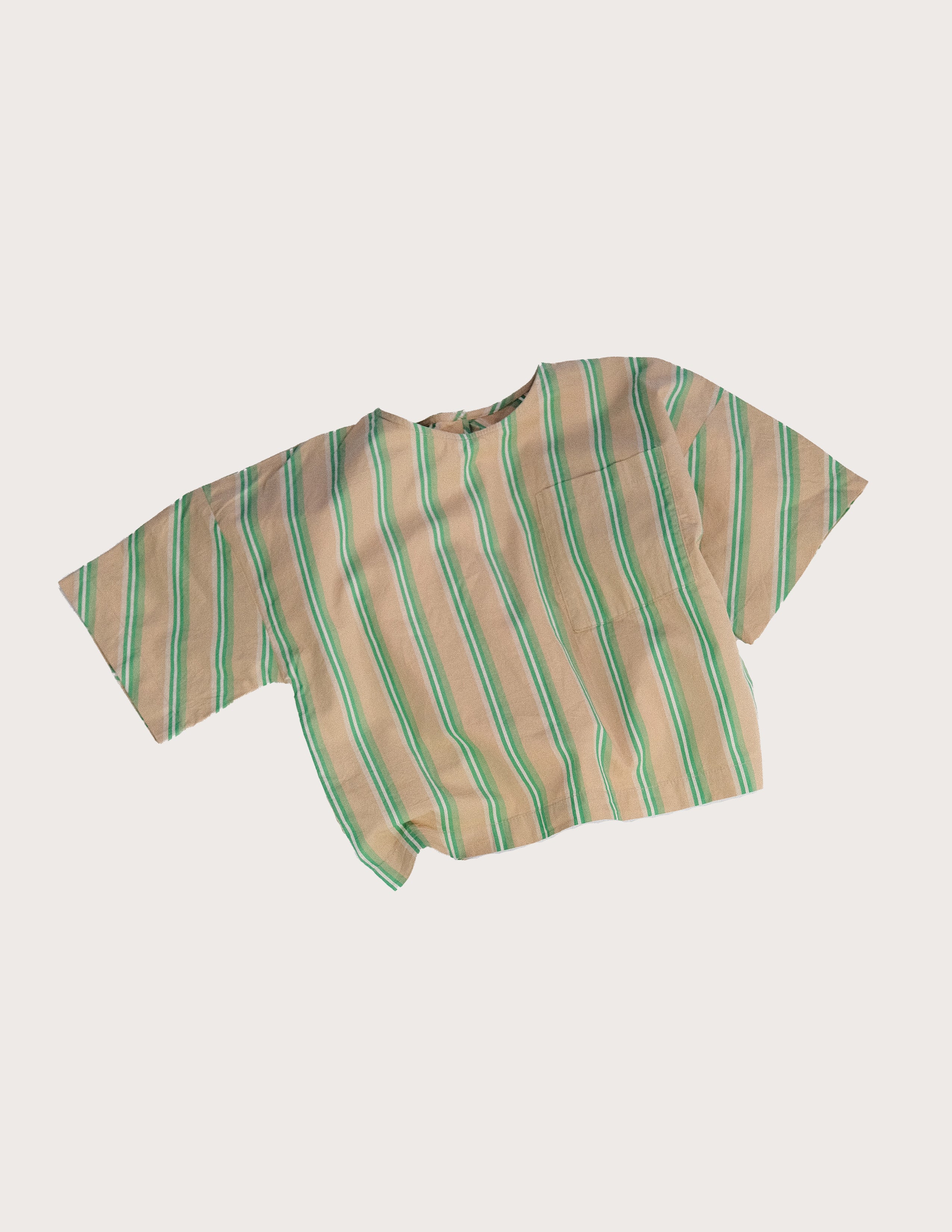 This unisex, boxy-fit summer shirt, crafted from 97% organic cotton and 3% elastane with bioresin buttons, brings comfort and sustainability to children's clothing rental options.